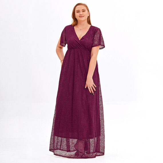 Overweight Women Plus Size V-Neck Floral Lace A-line Evening Party Long Maxi Dresses Wine Red