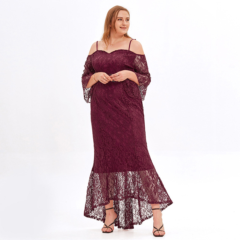 Over Weight Women’s Plus Size Long Sleeve Floral Lace Off Shoulder Wedding Mermaid Dress – Wine Red