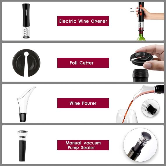 - 4-piece set Wine Lover Collection: Combo of electric wine Bottle Opener, Foil Cutter, Wine Aerator Pourer, and Vacuum Stopper.